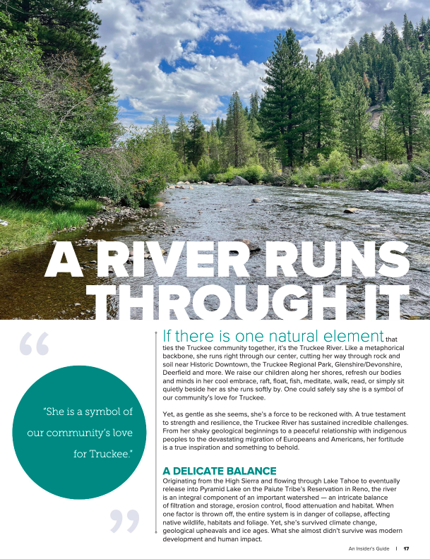 If there is one natural element that ties the Truckee community together, it’s the Truckee River. Like a metaphorical backbone, she runs right through our center, cutting her way through rock and soil near Historic Downtown, the Truckee Regional Park, Glenshire/Devonshire, Deerfield, and more. We raise our children along her shores, refresh our bodies and minds in her cool embrace, raft, float, fish, meditate, walk, read, or simply sit quietly beside her as she runs softly by. One could safely say she is a symbol of our community’s love for Truckee.