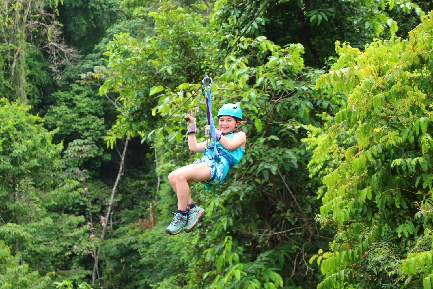 As she made her way to the next platform, she released her grip from the ropes between her legs, dangling her arms over her head, fingertips reaching down to the jungle floor far below. Her face was plastered in ultimate joy, mouth open in a gaping smile, holding nothing back, in the way that kids do. My 8-year-old daughter was absolutely crushing it, and I was surprised by her verve, she is usually one to sit back and assess situations before going all out. This was a new H I hadn’t really seen yet.